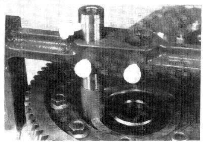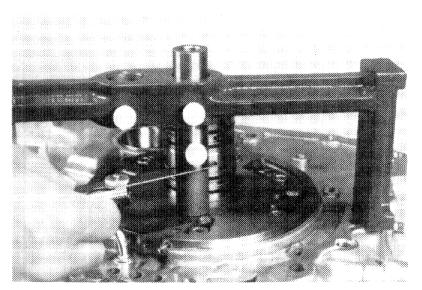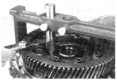 e. Place bridge, legs up, onto machined gasket surface of transmission case, allowing gauging plunger to rest on surface where bearing race was removed. Lock plunger in place.