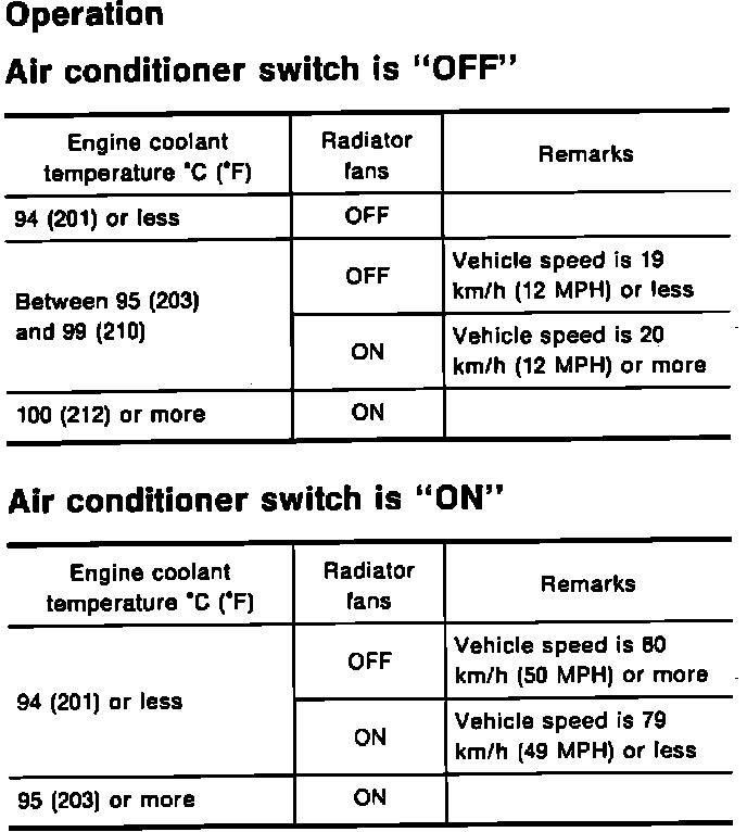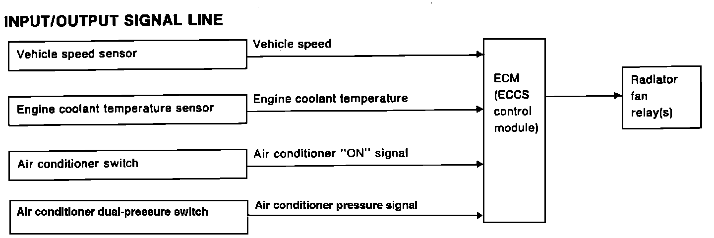 The ECM provides the ground signals to the radiator fan relays to control fan speed and operation based on signals supplied from the engine coolant temperature sensor, air conditioner switch, vehicle speed sensor and air conditioner dual-pressure switch. Automatic Transmissions models have a 3-step control system [HIGH/LOW/OFF]. Manual Transmission models have a 2-step control system [ON/OFF].