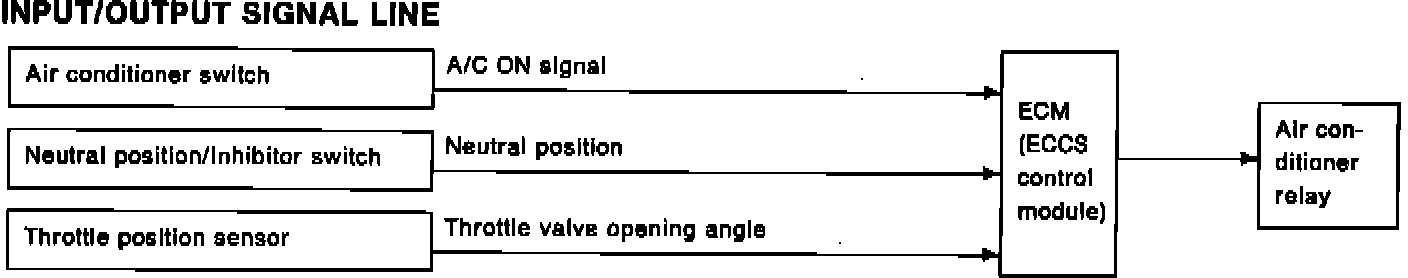 The Engine Control Module (ECM) uses signals from the A/C Switch, Neutral Switch and the Throttle Position Sensor to cut power to the A/C Clutch Relay. This system improves acceleration when the A/C is used.