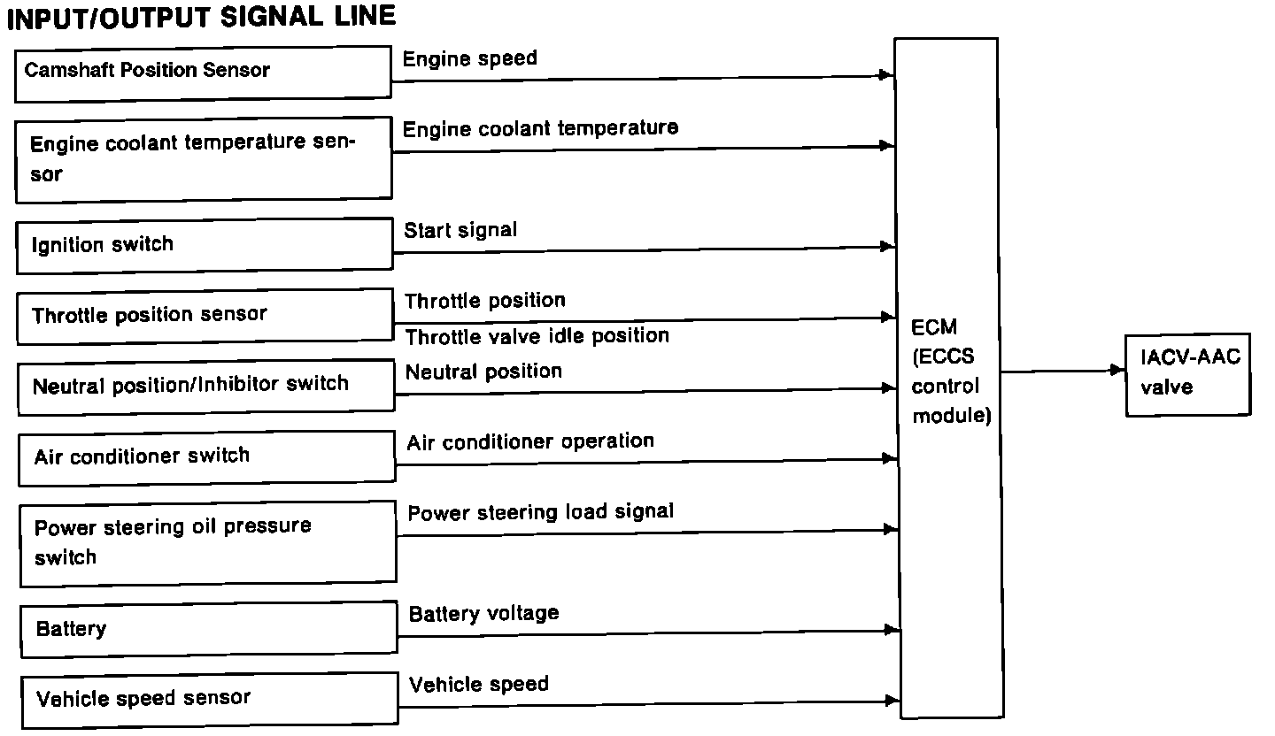 Idle speed is controlled by fine adjustment of the amount of air allowed to bypass the throttle valve via the Idle Air Control Valve-Auxiliary Air Control Valve (IACV-AAC). The IACV-AAC Valve repeats ON/OFF operation according to the signal sent from the Engine control Module (ECM). The Camshaft Position Sensor detects the actual engine speed and sends a signal to the ECM. The ECM then controls the ON/OFF time of the IACV-AAC valve so that engine speed coincides with the target value memorized in the ECM. The target engine speed is the lowest speed at which the engine can operate steadily. Optimum values stored in the ECM are determined by taking into consideration various engine conditions, such as warming-up and during deceleration, fuel consumption, and engine load.