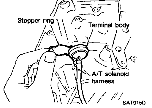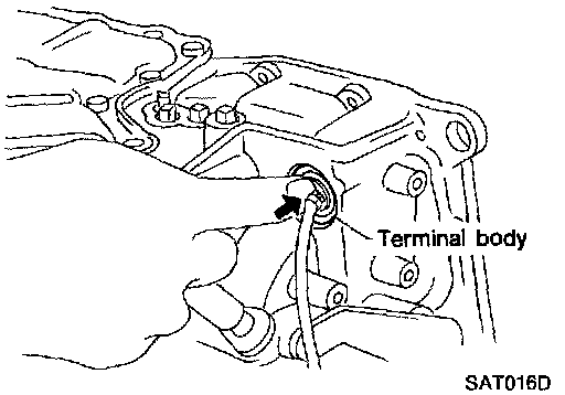c. Push terminal body into transmission case and draw out solenoid harness.