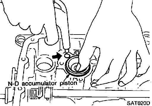 14. Remove N-D accumulator piston and return spring with compressed air.