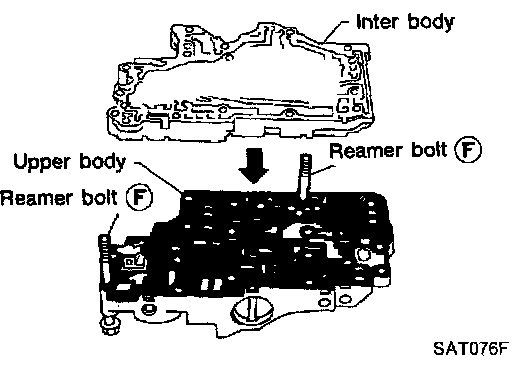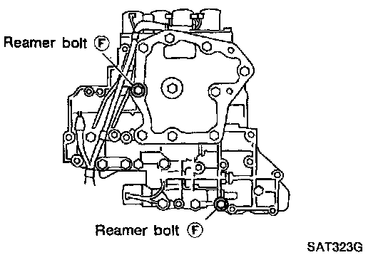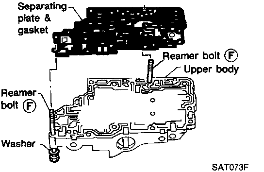 c. Install reamer bolts (f) from bottom of upper body and install separating plate and gaskets as a set on upper body using reamer bolts as guides.