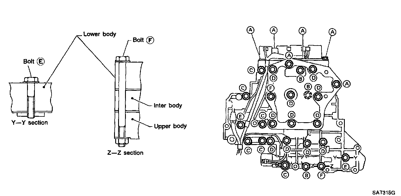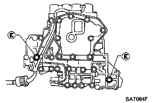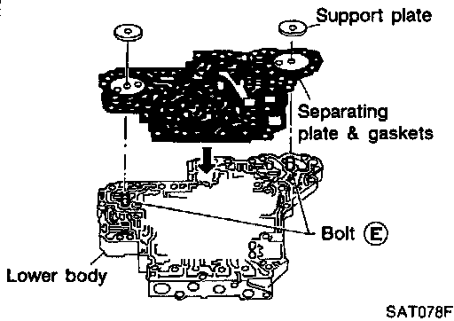 i. Install bolts (E) from bottom of lower body and install separating plate and gaskets as a set on lower body using bolts (E) as guides.