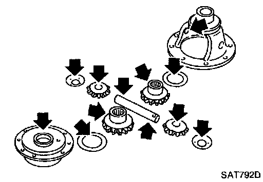 - Check mating surfaces of differential case, side gears, pinion mate gears and viscous coupling.