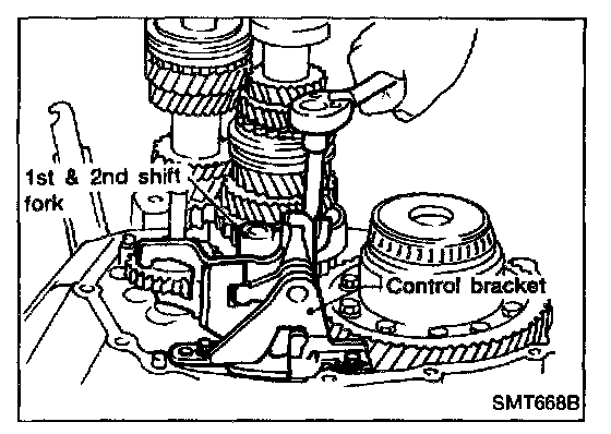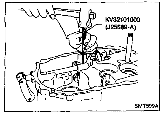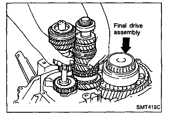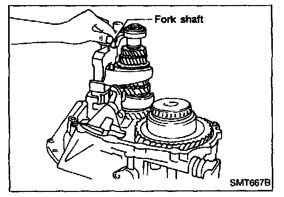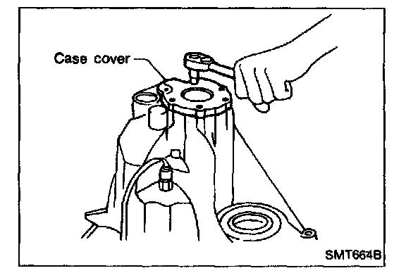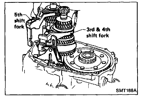 3. Remove transmission case while slightly tilting it to prevent 5th shift fork from interfering with transmission case.