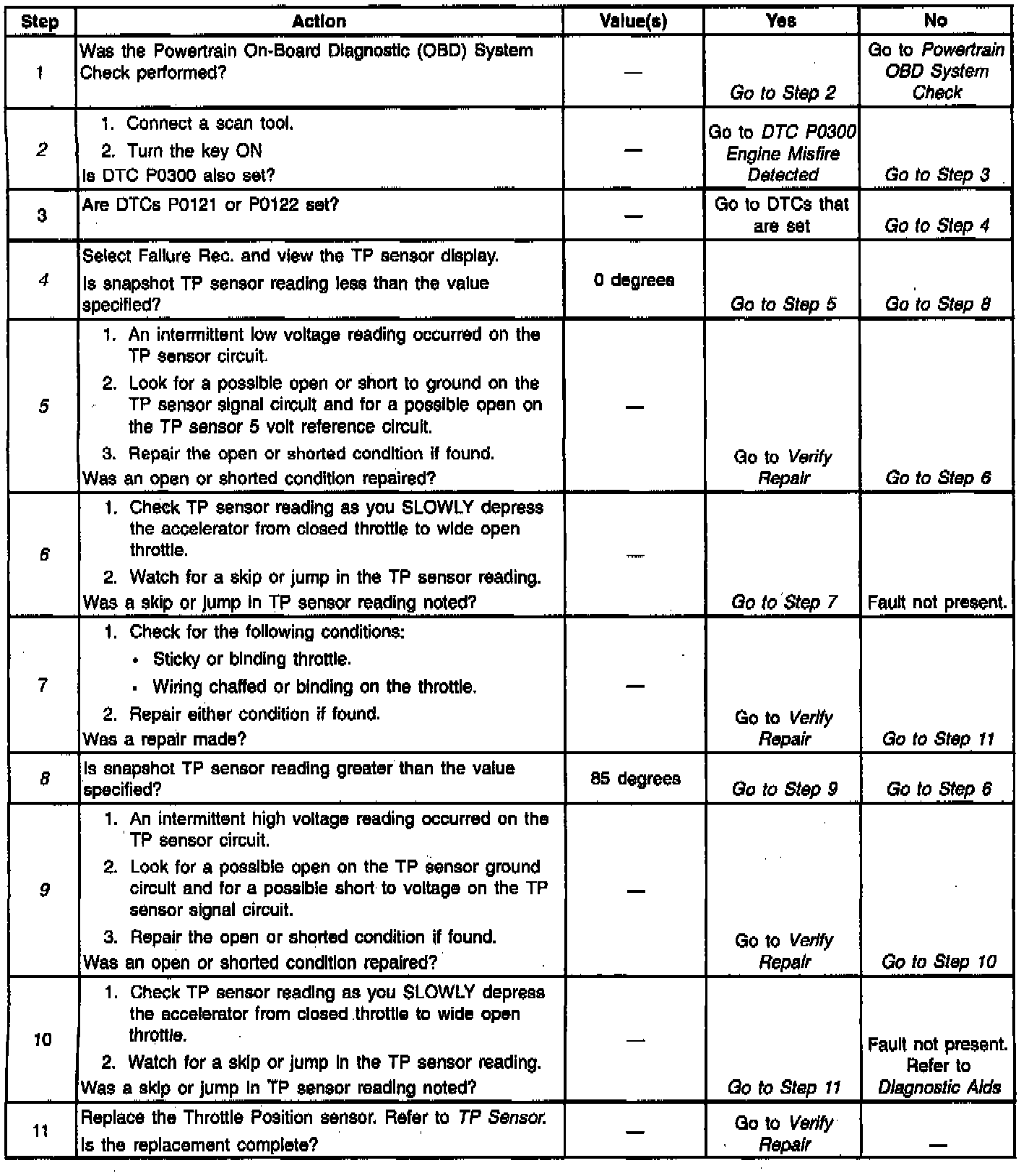 5. An intermittent low voltage can be caused by an open or short to ground on the TP sensor circuit or by an open in the TP sensor 5 volt reference circuit or the TP sensor itself.