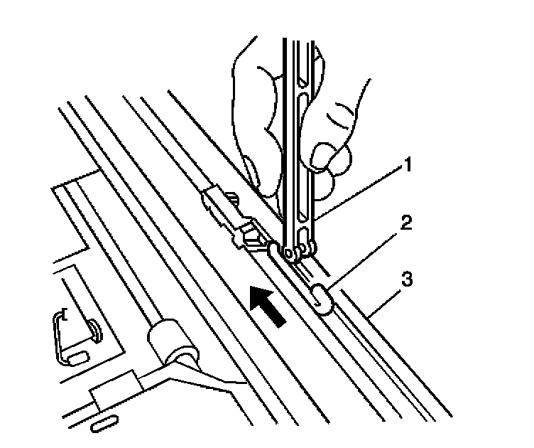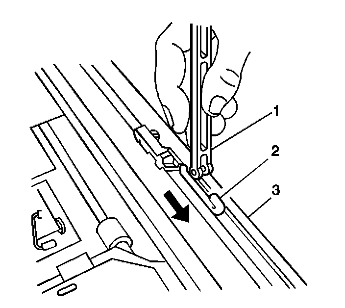 1. Engage the rear of the air deflector (1) into the side hooks (2) on the sunroof module (3).