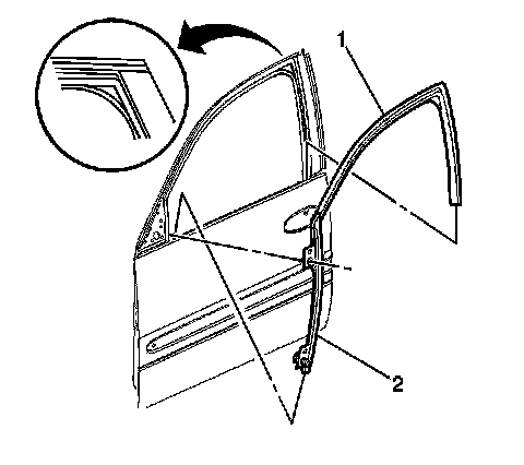 1. Install the window weatherstrip (1) to the door starting in the top corner working out in both directions.