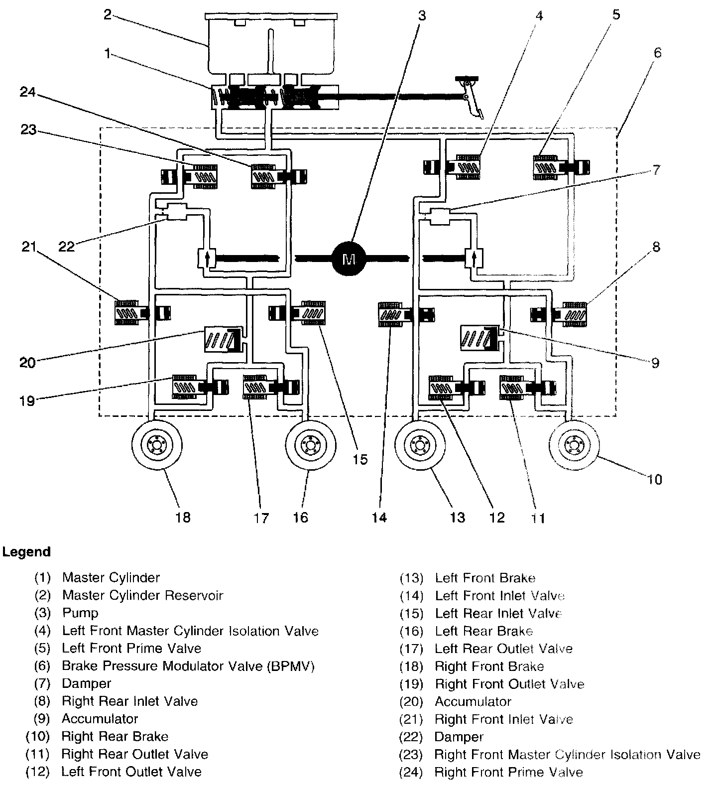 ^ Brake Pressure Modulator Valve (BPMV) - The BPMV contains the hydraulic valves and pump motor that are controlled electrically by the EBCM. The BPMV uses a 4 circuit configuration with a diagonal split. The BPMV directs fluid from the reservoir of the master cylinder to the left front and right rear wheels and fluid from the other reservoir to the right front and left rear wheels. The diagonal circuits are hydraulically isolated so that a leak or malfunction in one circuit will allow continued braking ability on the other.
