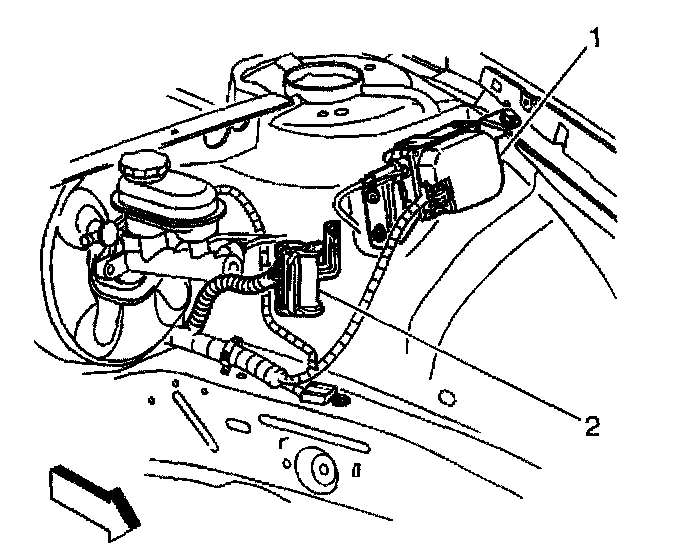 14. Disconnect the electrical connector (2) at the left strut tower.