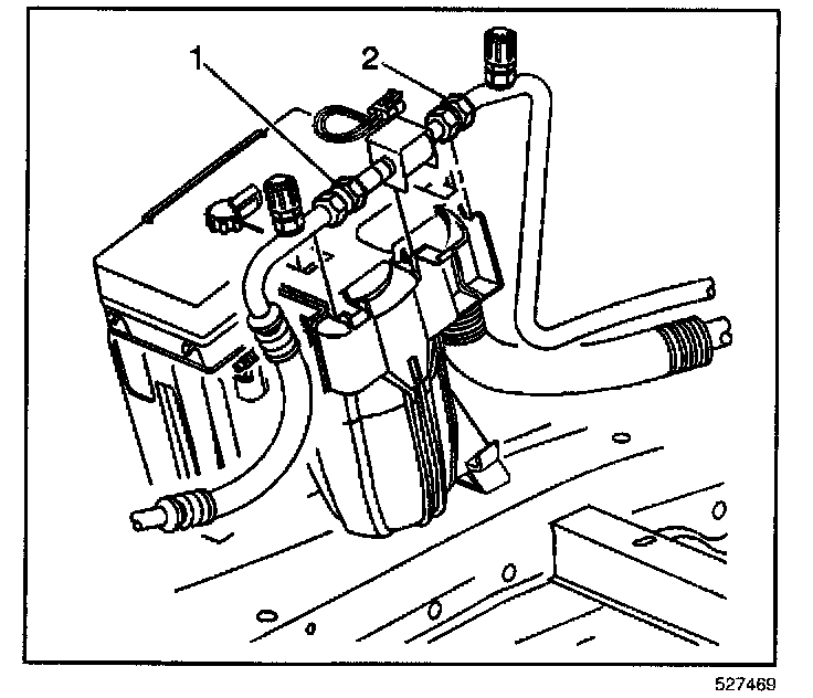 3. Disconnect the A/C evaporator hose (2) from the orifice valve.