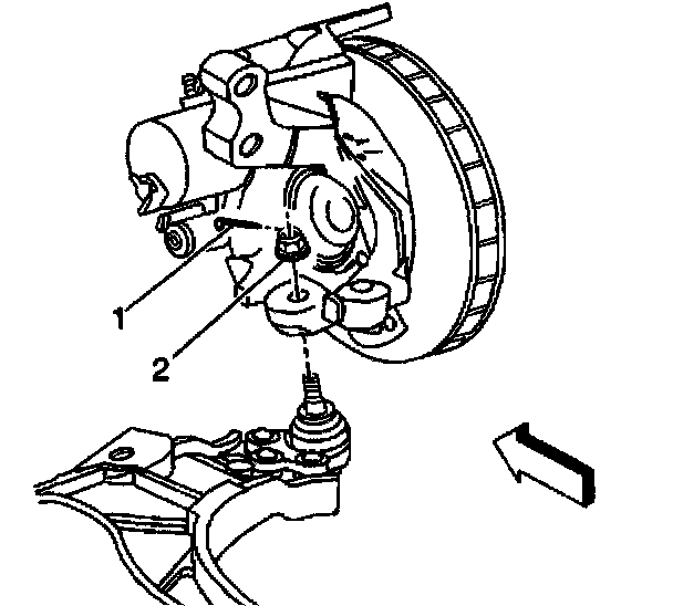 Tighten the lower ball joint nut (2) to 10 Nm (88 inch lbs.) plus an additional 180 degrees. For cotter pin alignment, tighten the nut up to, but do not exceed 60 degrees additional rotation. Do not back off nut for cotter pin (1) alignment.