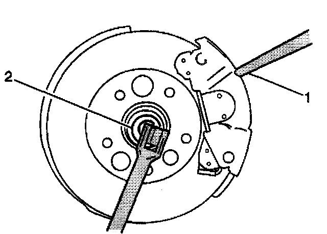 6. Install the drive axle (2) nut by inserting drift of screwdriver (1) into the caliper and rotor in order to prevent rotor from turning.