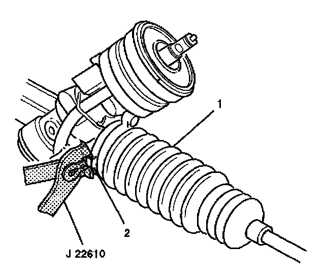 7. Install the boot clamp (2) on the rack and pinion boot (1) with J22610.