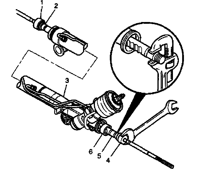 6. Place a wrench on the flats of the inner tie rod housing (4).