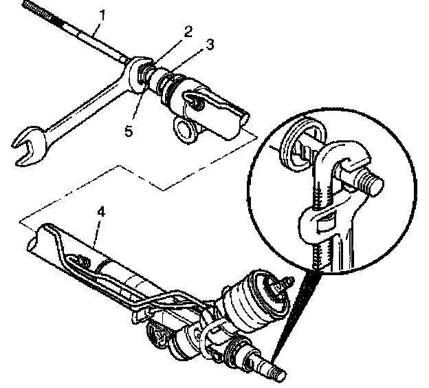 5. Place a pipe wrench on the rack (5) next to the inner tie rod housing (4).