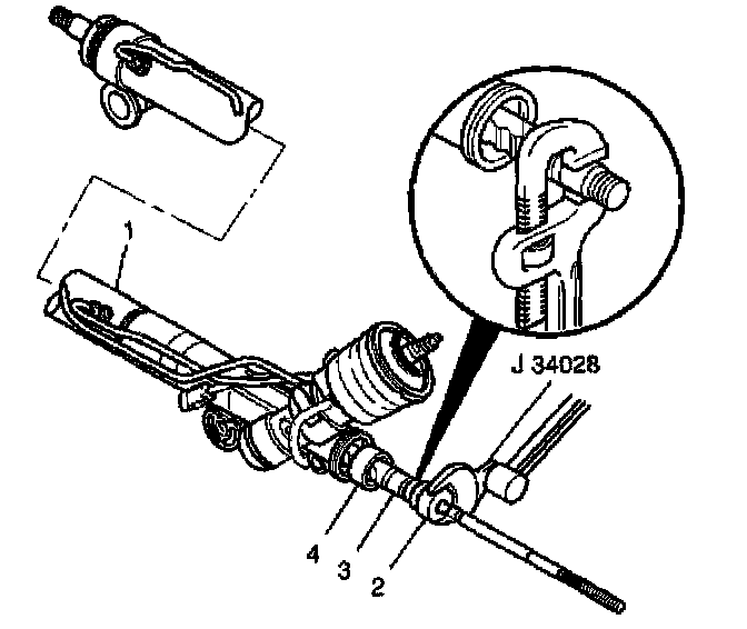 5. Place a torque wrench and J34028 on the flats of the inner tie rod housing (2).