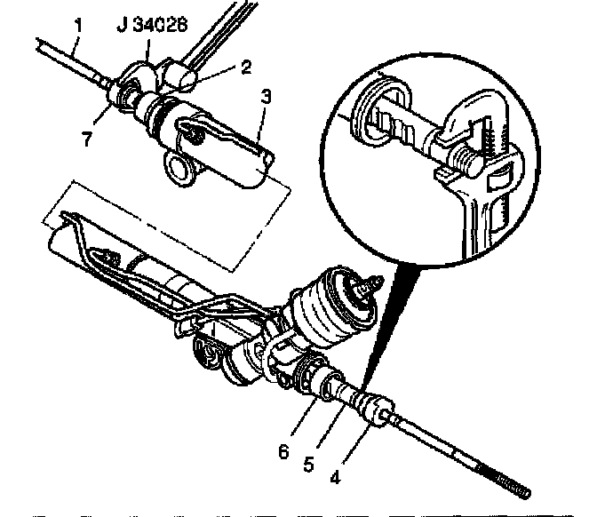 10. Place a torque wrench and J34028 on the flats of the inner tie rod housing (7).