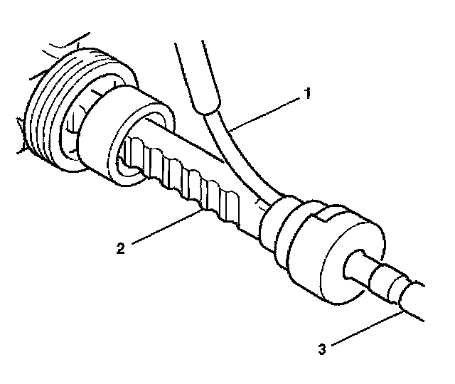 14. Slide the shock dampener (2) over the inner tie rod housing (3) until the front lip of the shock dampener (2) bottoms against the inner tie rod housing (3).