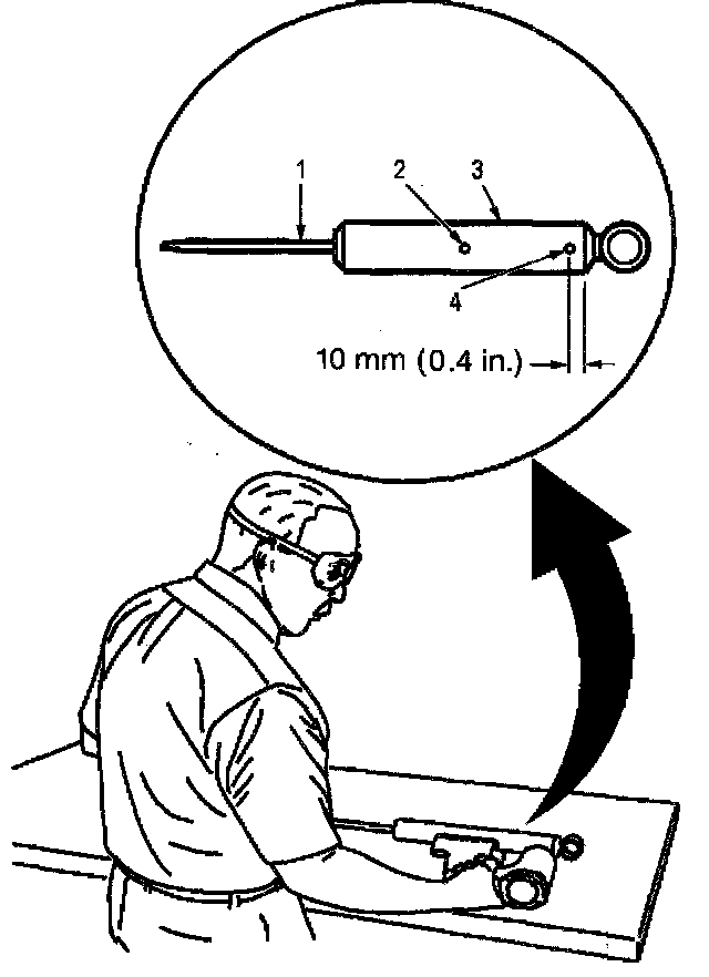 3. Drill a hole in the shock absorber at the centerpunch (4) using a 5 mm (3/16 inch) drill bit. Gas or a gas/oil mixture will exhaust when the drill bit penetrates the shock absorber. Use shop towels in order to contain the escaping oil.