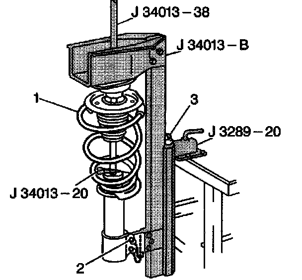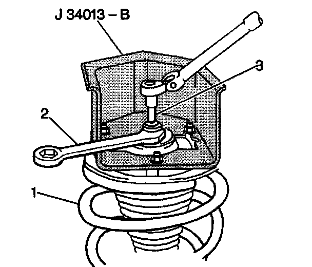 1. Install the strut in the J34013-B with the J34013-20 clamped on the strut shaft (1) in the strut compressor.