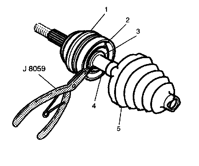5. Spread the ears on the race retaining ring (3) using J8059 and remove the CV joint assembly from the bar (4).