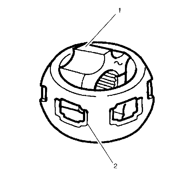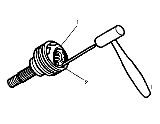 12. Rotate the CV joint inner race 90 degrees to the centerline of the CV joint cage with the lands of the CV joint inner race (1) aligned with the windows of the CV joint cage (2).