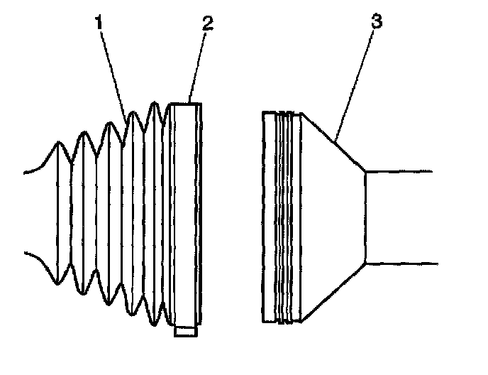 13. Slide large diameter of the outboard seat (1) with the large seal retaining clamp (2) in place over the outside of the CV joint outer race (3) and locate the seal lip in the groove on the CV joint outer race (3).