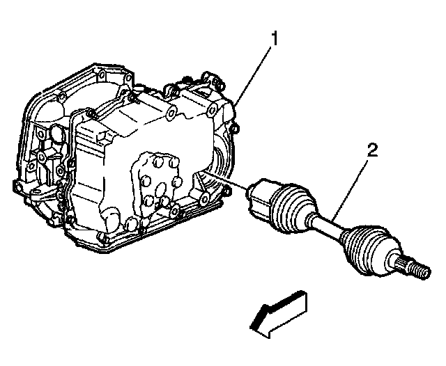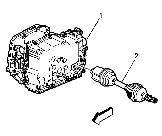 12. Using the J2619-01, the J29794, and the J33008-A, disengage the wheel drive shaft (2) from the transaxle (1).