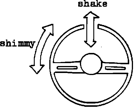 Road test the vehicle to verify the complaint.. The steering wheel oscillation (shimmy) normally will occur at cruising speeds between 55 and 68 mph (88 to 109 km/h) with its peak at 65 mph (104 km/h) using test drive or in-shop testing (see InShop Testing Procedures in this bulletin). Do not confuse steering shimmy (Figure 1) with braking and/or a body shake that results in vertical oscillation of entire body at highway speeds.