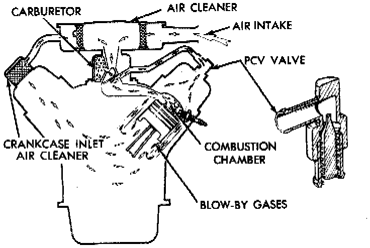 When the engine is running, air is drawn by manifold vacuum from the air cleaner through a hose, to the crankcase inlet air cleaner. From the crankcase inlet air cleaner, the air mixes with the vapors in the rocker arm chamber and crankcase and are then drawn up through the PCV valve in the cylinder head cover to a hose connected to either the intake manifold or carburetor base. These gases become part of the calibrated air/fuel mixture and are then drawn into the combustion chamber, burned and expelled with the exhaust gases.