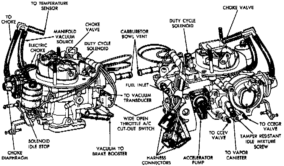 The 6520 electronic feedback carburetor also incorporates a duty cycle solenoid which provides a limited regulation of air-fuel ratio in response to electrical signals from the spark control computer. The solenoid meters the main fuel system and operates in parallel with a conventional fixed main metering jet. When there is no electrical signal applied to the solenoid, the valve spring pushes upward through the main system fuel valve, fully uncovering the solenoid controlled main metering orifice so that the richest condition exists within the carburetor for any given airflow. When the electrical signal is applied to the solenoid, the field windings are energized, thus causing the armature to move the push rod and main system valve downward against the valve spring. This movement will continue until the main system valve bottoms against the main system valve seat. In this position the solenoid controlled main metering orifice is fully sealed so that the leanest condition exists within the carburetor for any given airflow. This condition will remain unchanged until the signal from the spark control computer to the solenoid is switched off. The main system fuel may be regulated between richest and leanest limits by controlling the amount of time that the solenoid is in the power on position. Under normal operating conditions, 12 volts at a frequency of 10Hz is applied to the field windings. By controlling the duration of the voltage signal, the power on time to total time, referred to as the duty cycle, is established.