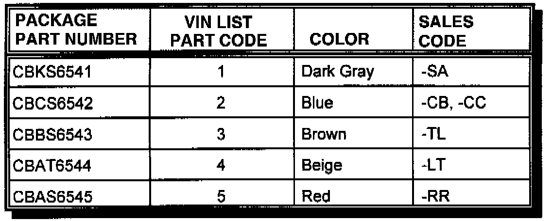 Five (5) part packages are required depending upon the color of the vehicle interior. The Vehicle VIN List provided to each involved dealer includes a Dart code which identifies the required part number package for each VIN. This code is located in the third column of the VIN list and is identified by the "P" column header. Use the table to identify the correct part package for the vehicle being serviced.