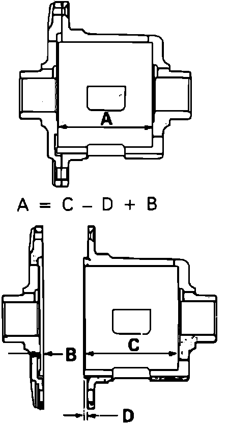 a. Obtain differential case depth (A) by subtracting dimension (D) from dimension (C) then adding dimension (B) as shown. This represents distance between clutch plate contact surface when case halves are assembled.