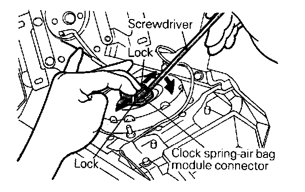 2. When disconnecting the connector of the clock spring from the air bag module, press the air bag's lock toward the outer side to spread it open. Use a screwdriver, as shown in the figure to the right, to pry so as to remove the connector gently.