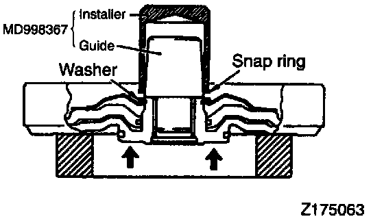Put the Installer over the Guide and use a press to install the snap ring in the groove. If the snap ring is installed in the groove, stop using the press. Do not use the press more than necessary. Further, be sure not to support the portion (center protruded portion) marked with arrows in the illustration.