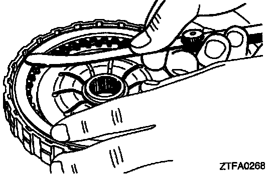 1. Check clearance between the snap ring and clutch reaction plate. To check the clearance, hold entire circumference of the clutch reaction plate down with 50 Nm (11 lbs.) force. If clearance is out of standard value, select a snap ring to obtain the standard value.