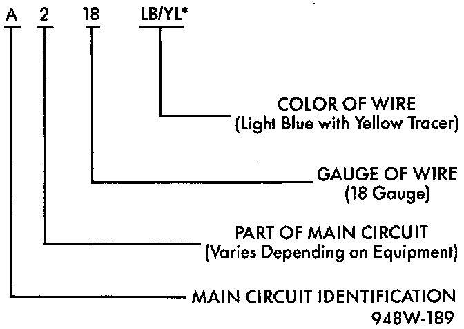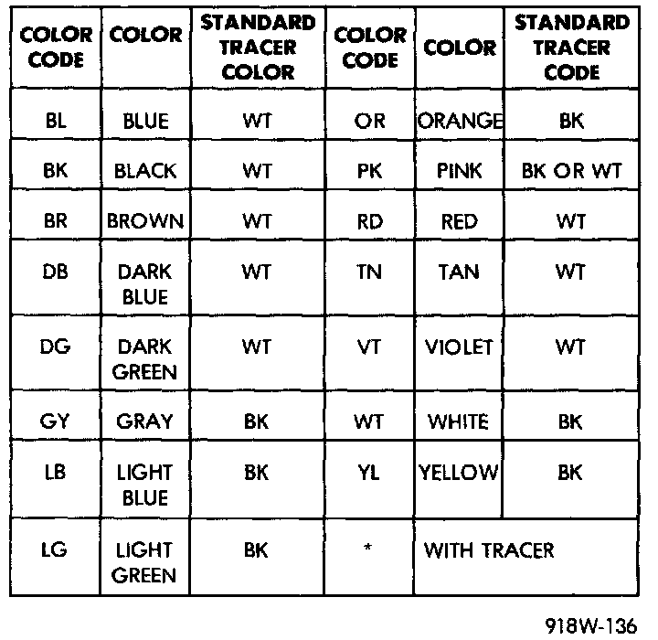 Each wire shown in the diagrams contains a code which identifies the main circuit, part of the main circuit, gauge of wire, and color. The color is shown as a two-letter code, which can be identified by referring to the Wire Color Code chart. If the wire has a tracer, and it is a standard color, an asterisk will follow the main wire color. If the tracer is non-standard, the main wire color will have a slash (/) after it, followed by the tracer color.