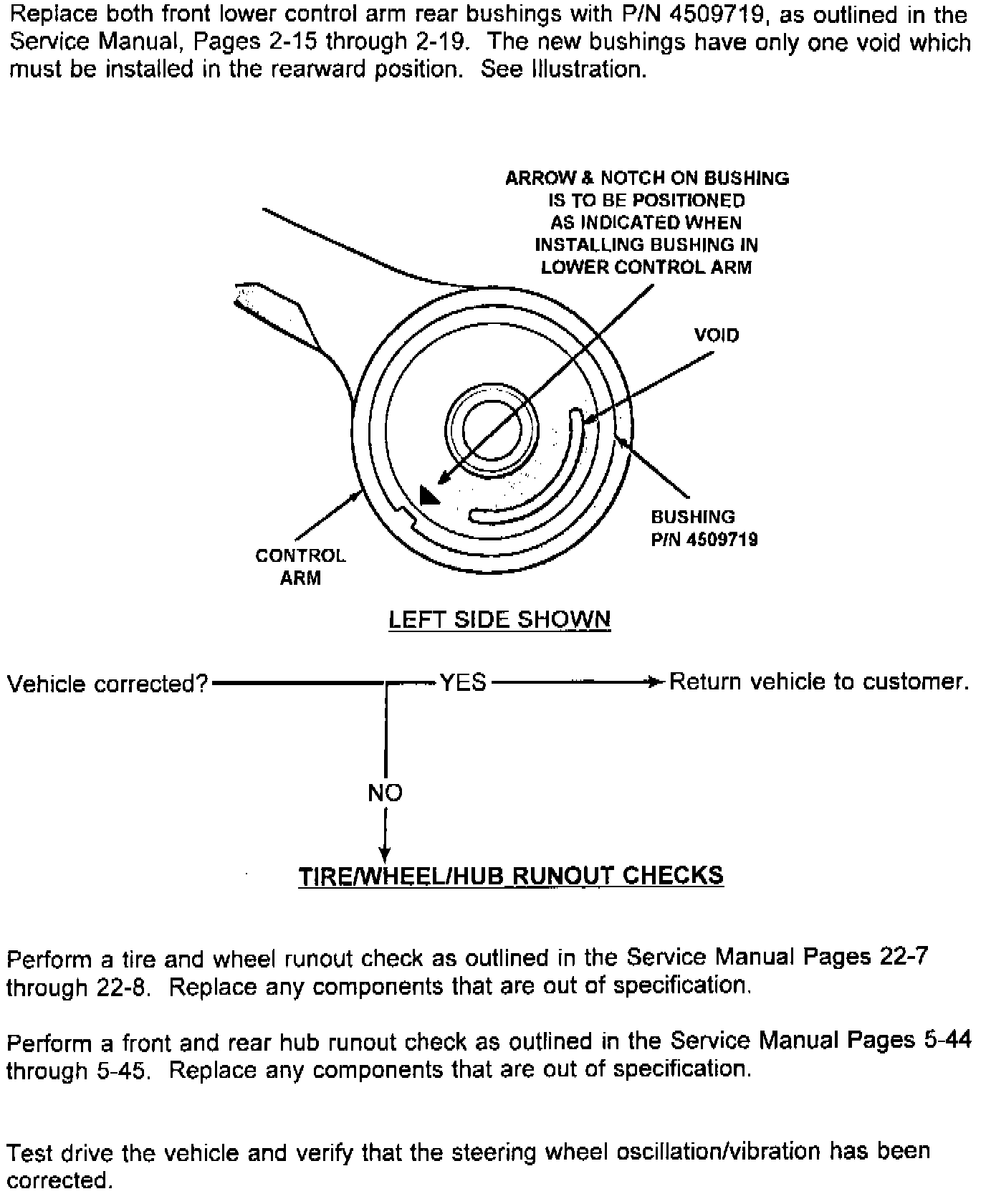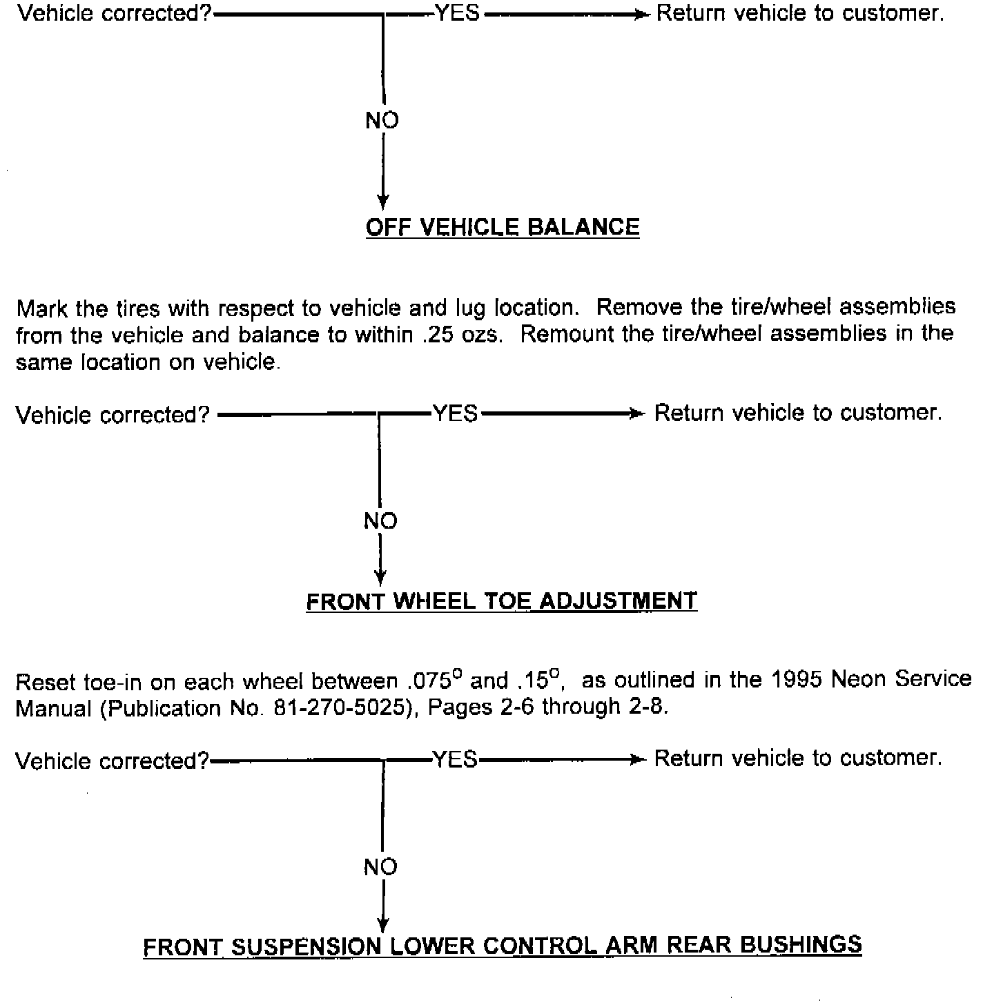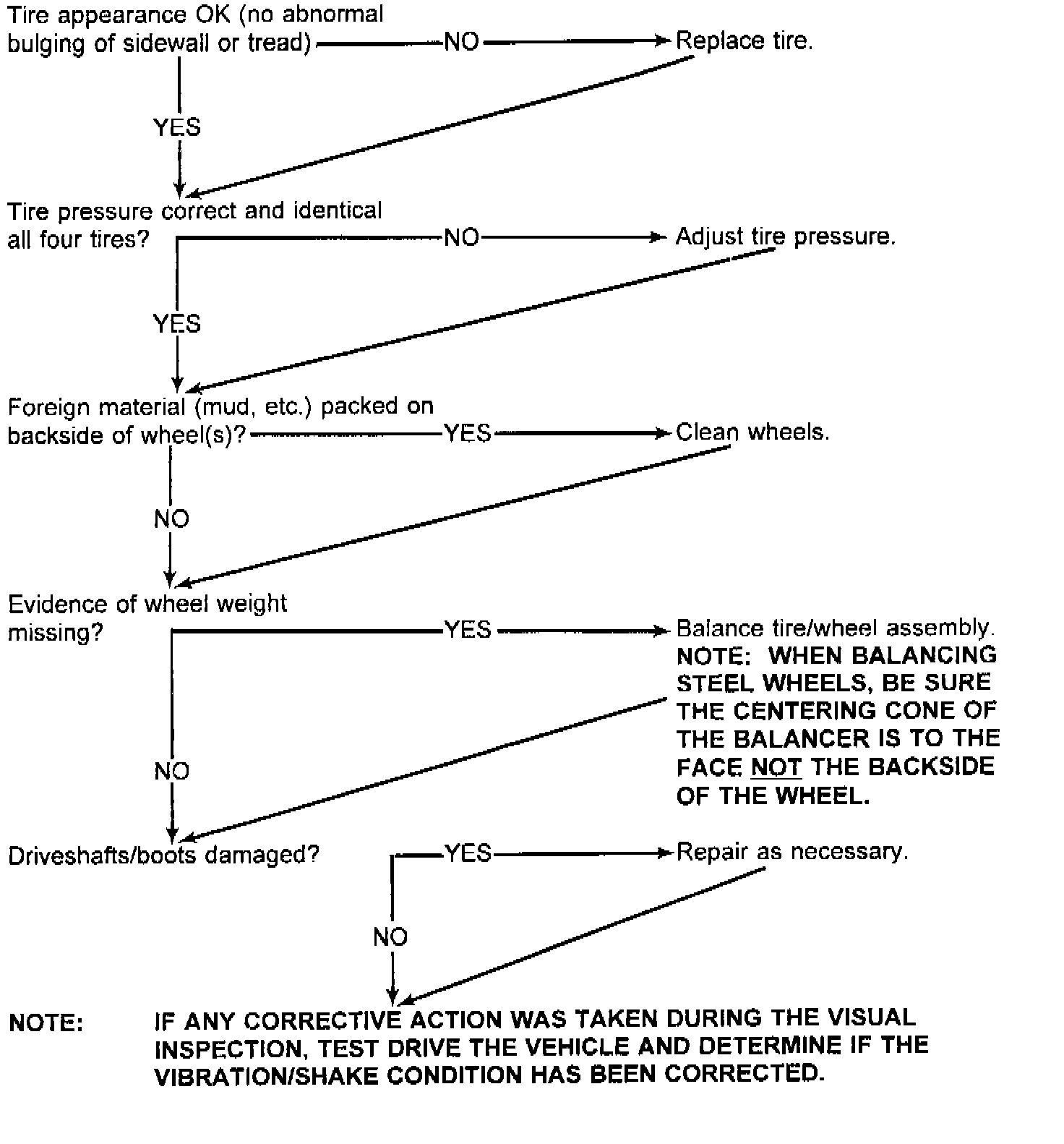 Dynamic Check, Visual Insp., Road Test, Balance Tires, 2nd Road Test, Align Front End & Install Lower Control Arm Bushing, 3rd Road Test, and Check Wheel/Tire and Front and Rear Hub Runout