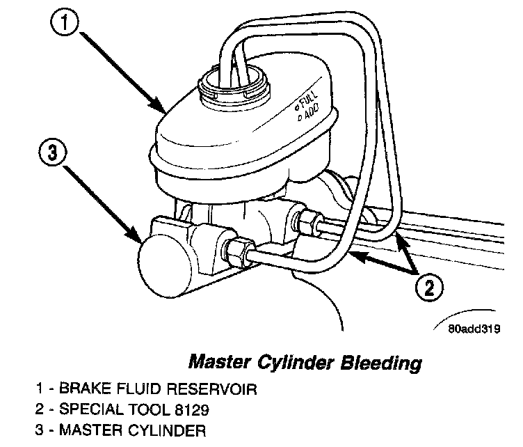 1. Attach Bleeding Tubes, Special Tool 8129 to the master cylinder. Position bleeding tubes so outlets will be below the surface of the brake fluid when the fluid reservoir is filled to the proper level.