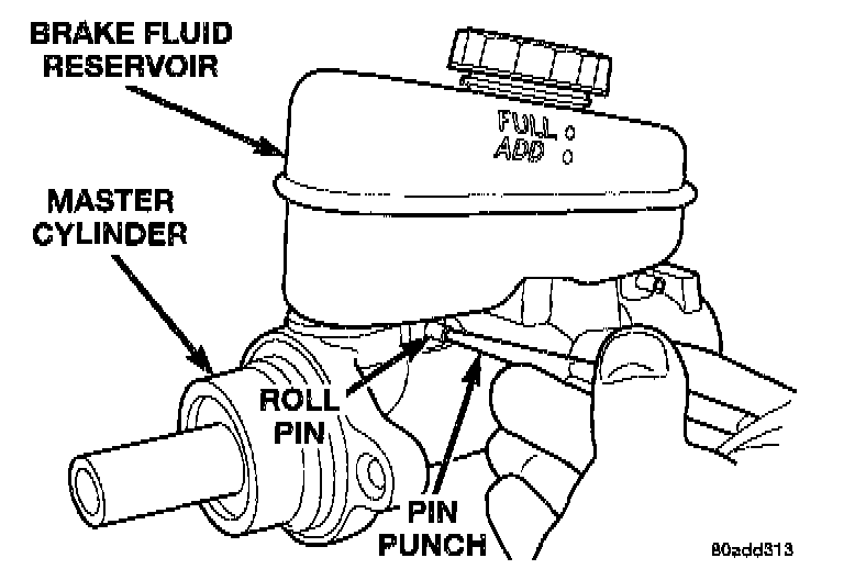 6. Using a pin punch install the 2 roll pins retaining the brake fluid reservoir to the master cylinder.