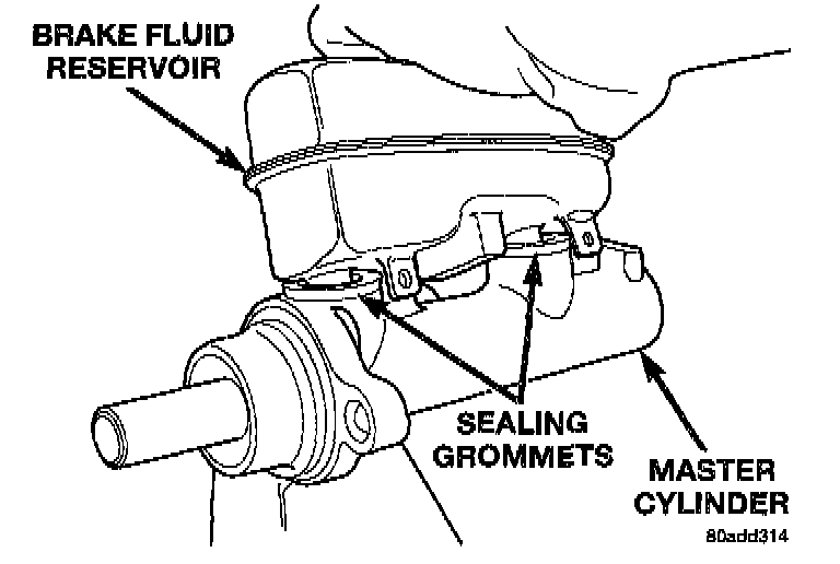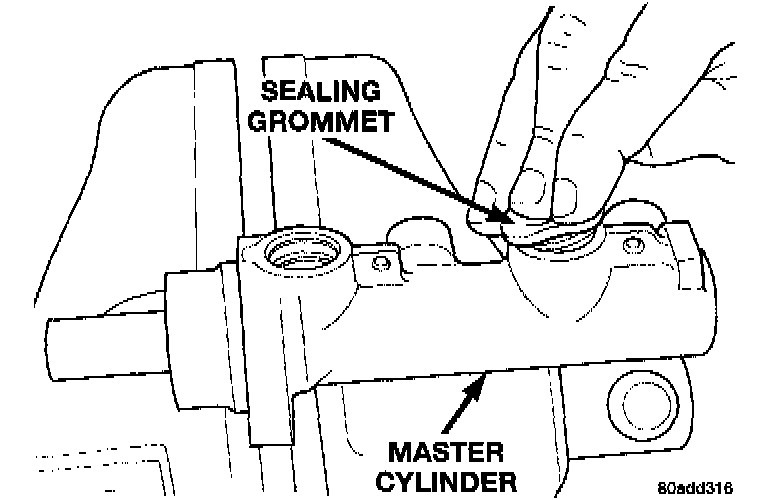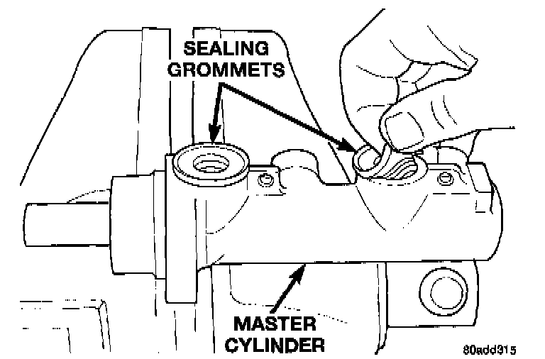 7. Remove master cylinder-to-fluid reservoir sealing grommets from master cylinder.