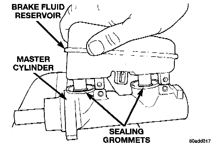 Caution: The brake fluid reservoir to master cylinder sealing grommets can not be reused. Discard the sealing grommets after removing them from the master cylinder.