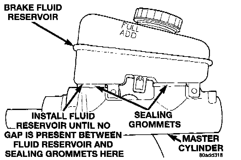 5. Make sure brake fluid reservoir is installed on master cylinder until bottom of reservoir touches the top of both seal grommets.