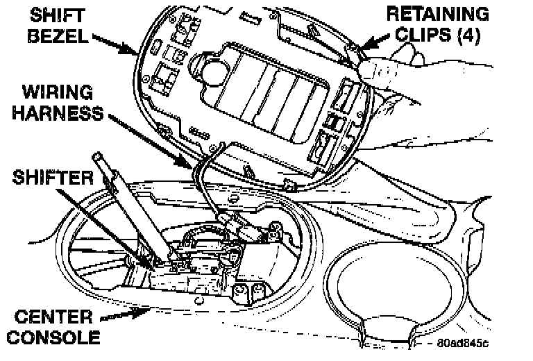 2. Remove the shift bezel from the center console. Shift bezel is removed by carefully pulling upward along the edge until the retaining clips unlatch from the center console.
