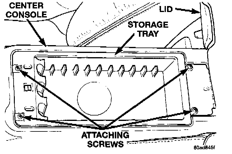 5. Remove the 4 screws mounting the storage tray and lid to the center console. Remove the lid and storage tray from the center console.