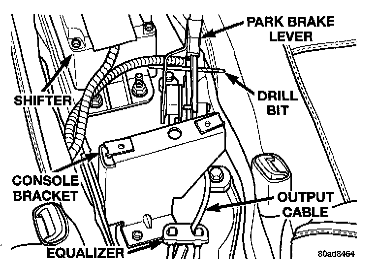 9. Grasp park brake lever output cable by hand and pull upward. Continue pulling on cable until a 3/16 inch drill bit can be inserted into handle and sector gear of park brake mechanism. This will lock the park brake mechanism and take tension off park brake cables.