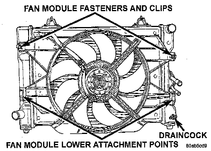 5. Remove fan module to radiator fasteners and retaining clips. Lift fan module upward to release the lower attachment points and remove module from radiator.