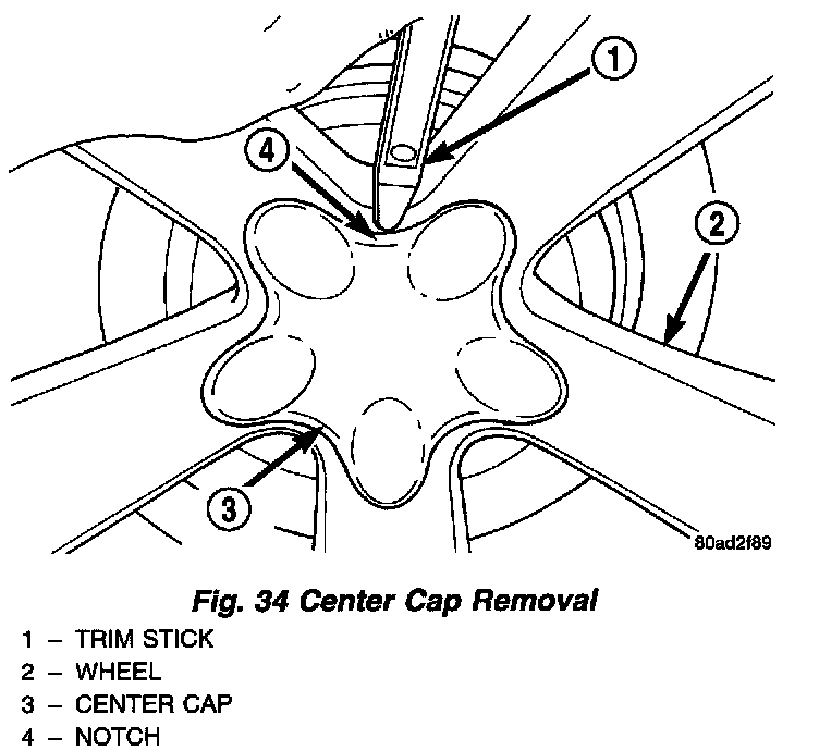 1. Remove the center cap from the wheel. Center cap is removed by inserting a trim stick into the notch on the center cap and prying it off the wheel.